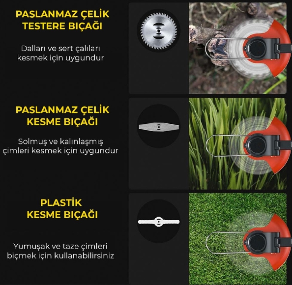 - Plastik kesme bıçağı: Yumuşak ve taze çimleri kesmek için uygundur.